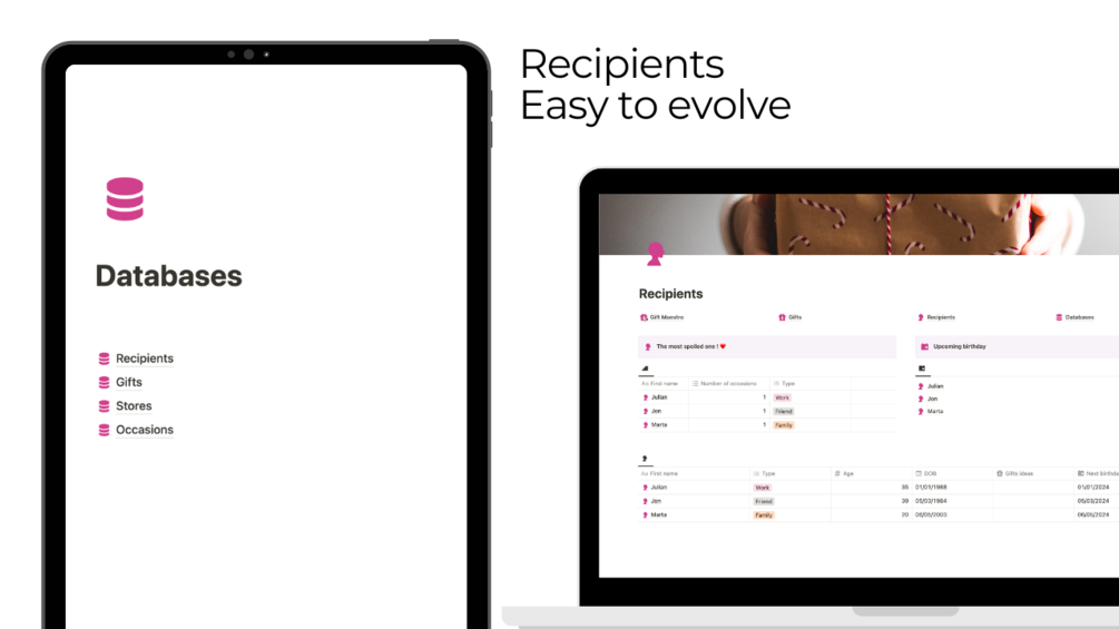 This Notion template is an all-in-one solution designed to streamline your gift planning process. With it, you can keep track of gifts, recipients, occasions, and even view upcoming birthdays in advance - ensuring that you never miss an opportunity to spread joy.