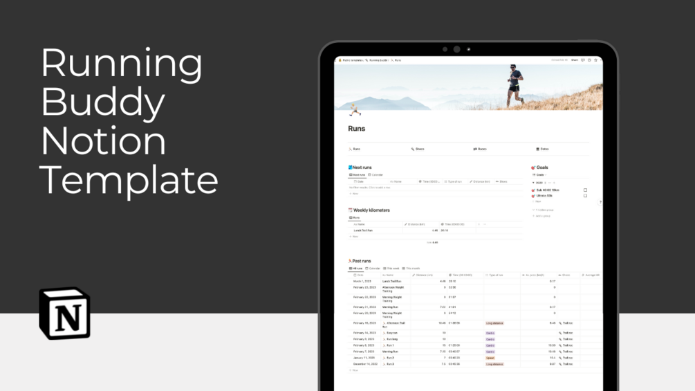 Welcome to Running Buddy, the ultimate tool for runners to manage their training, races, and materials. With this template, you can keep track of your runs, log your miles, and monitor your progress. You can also create a library of your shoes and keep track of their usage and maintenance.