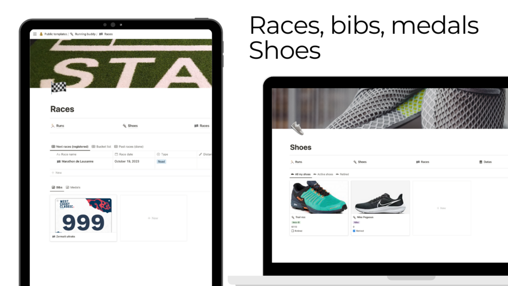 Welcome to Running Buddy, the ultimate tool for runners to manage their training, races, and materials. With this template, you can keep track of your runs, log your miles, and monitor your progress. You can also create a library of your shoes and keep track of their usage and maintenance.